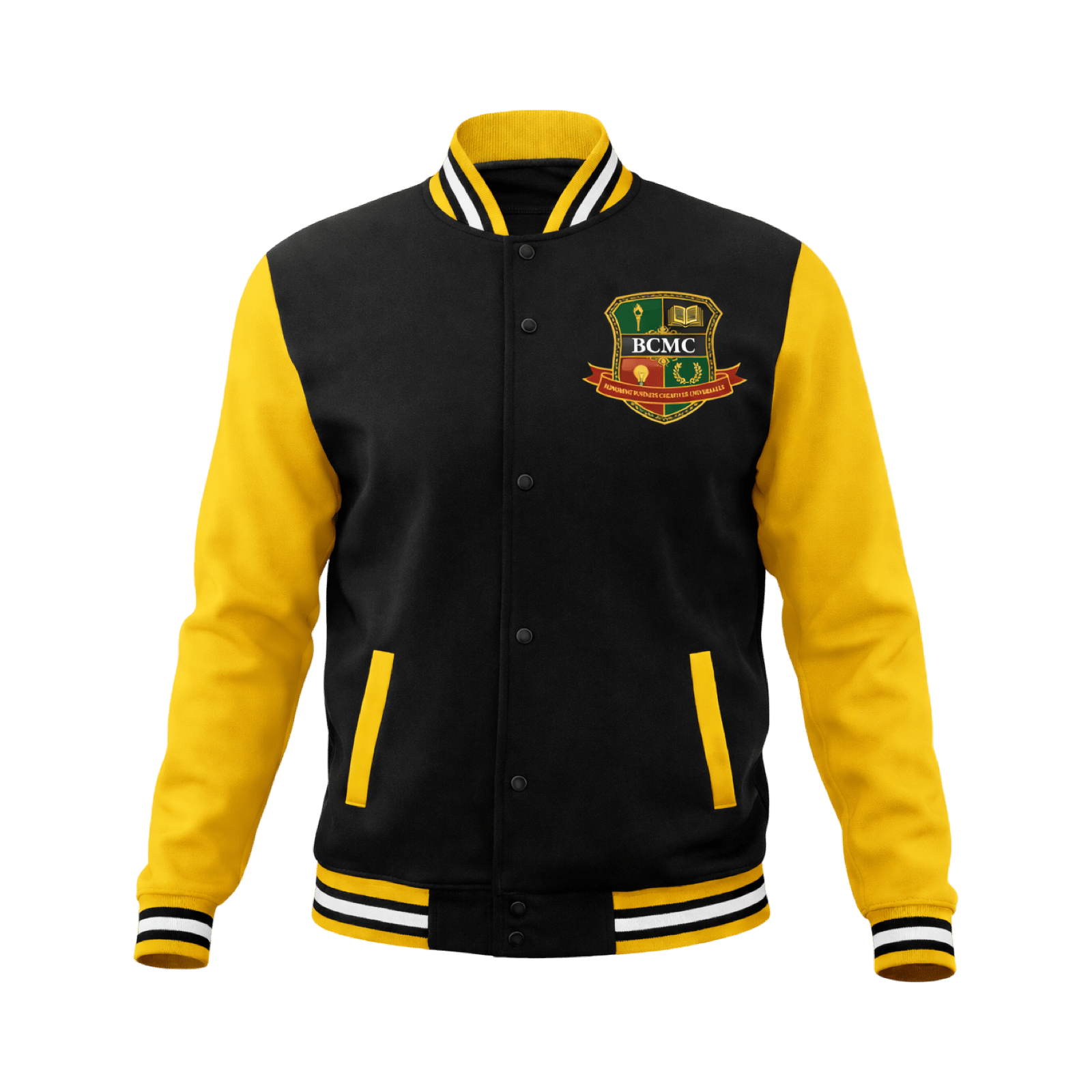-Full-snap varsity/letterman jacket | Lightweight polyester exterior | Cozy cotton interior lining for warmth | Wrinkle-resistant material | Precision BCMC 4-inch logo embroidery (no fading or shedding) | Two external side hand pockets | Comfortable for autumn and early winter weather | US Men’s sizing (unisex fit)
